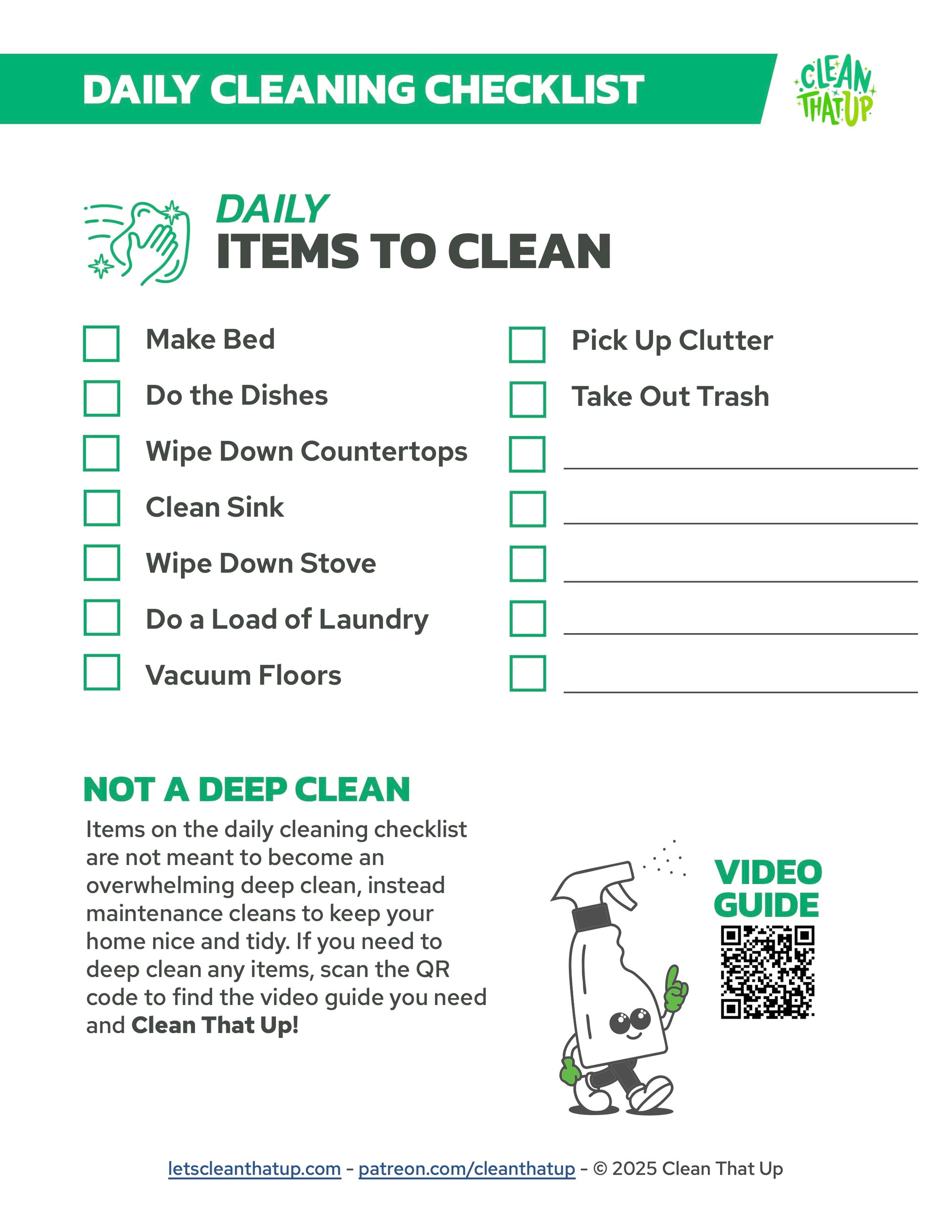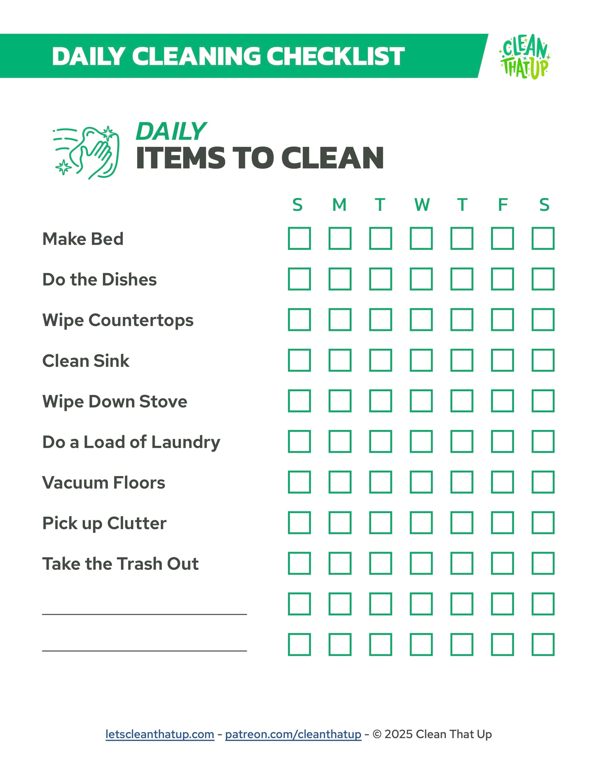 Keep your home clean every day by following these simple tasks! This two page checklist is available to help keep your home clean and tidy!